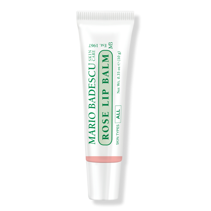 Mario Badescu Lip Balm . Summary Mario Badescu's Squeeze Tube Lip Balm softens and nourishes dry lips with a blend of nutrient-dense butters and ultra-moisturizing oils. Rose Lip Balm features the same cushion-y, ultra-moisturizing base with