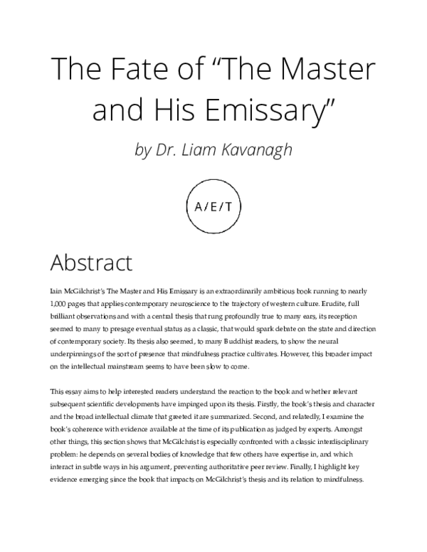 The Master And The Emissary. The Master and His Emissary By Iain McGilchrist, The Origins of Victory [Hardcover] By Andrew F That is why he appoints the emissary in the first place Until recently, the left hemisphere of our brain has been seen as the 'rational' side, the superior partner to the right